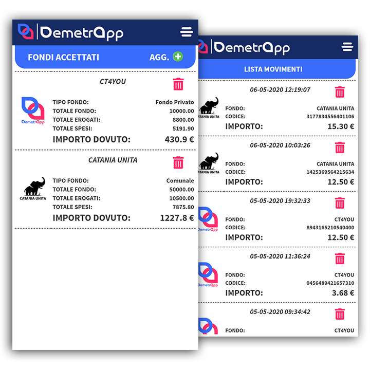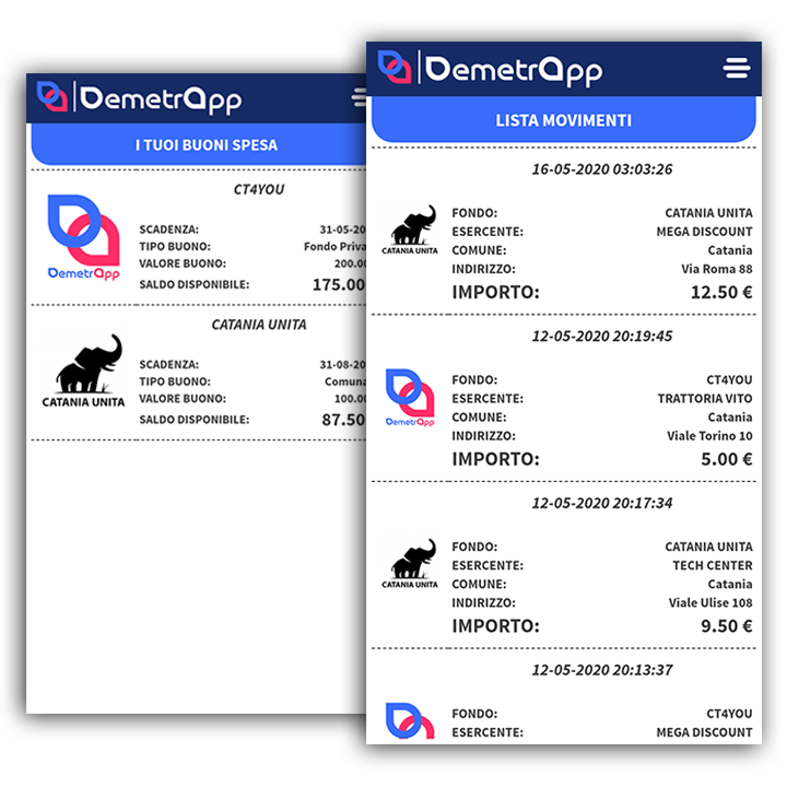 DemetrApp offre inoltre al gestore dei fondi (sia esso un’Ente o un’associazione), un pratico gestionale dove poter monitorare e gestire i Fondi ed i Beneficiari dei buoni, oltre alla possibiltà di visione degli Esercenti Aderenti alle proprie campagne e di tutti i movimenti effettuati, cosi da garantire la massima trasparenza e permettere di erogare facilmente il pagamento dei Buoni Spesa.